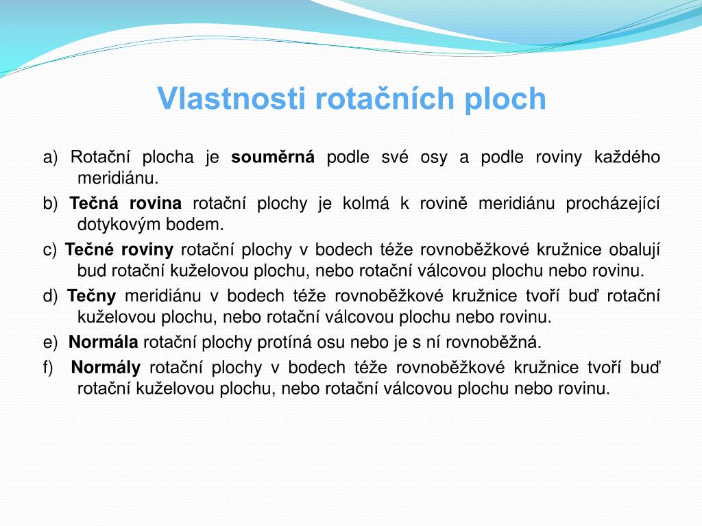 Vlastnosti rotačních ploch a) Rotační plocha je souměrná podle své osy a podle roviny každého meridiánu. b) Tečná rovina rotační plochy je kolmá k rovině meridiánu procházející dotykovým bodem. c) Tečné roviny rotační plochy v bodech téže rovnoběžkové kružnice obalují bud rotační kuželovou plochu, nebo rotační válcovou plochu nebo rovinu. d) Tečny meridiánu v bodech téže rovnoběžkové kružnice tvoří buď rotační kuželovou plochu, nebo rotační válcovou plochu nebo rovinu. e) Normála rotační plochy protíná osu nebo je s ní rovnoběžná. f) Normály rotační plochy v bodech téže rovnoběžkové kružnice tvoří buď rotační kuželovou plochu, nebo rotační válcovou plochu nebo rovinu.