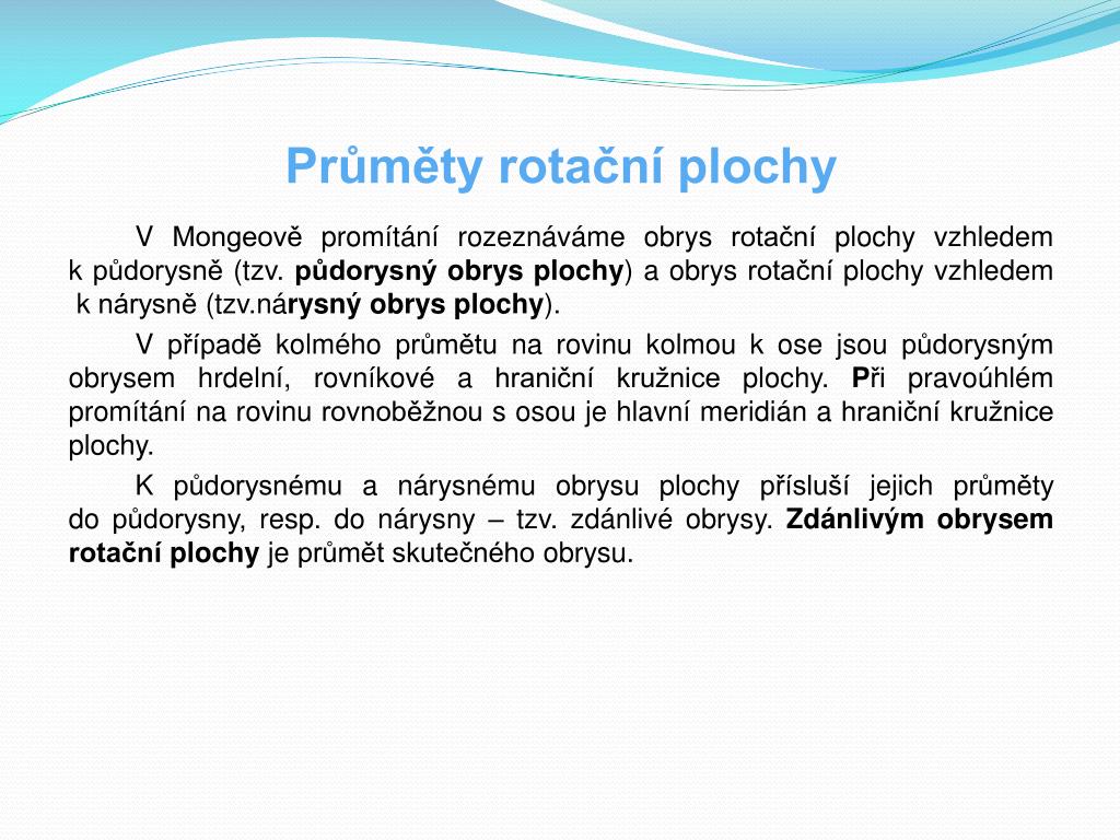 Průměty rotační plochy V Mongeově promítání rozeznáváme obrys rotační plochy vzhledem k půdorysně (tzv. půdorysný obrys plochy) a obrys rotační plochy vzhledem k nárysně (tzv.nárysný obrys plochy). V případě kolmého průmětu na rovinu kolmou k ose jsou půdorysným obrysem hrdelní, rovníkové a hraniční kružnice plochy.Při pravoúhlém promítání na rovinu rovnoběžnou s osou je hlavní meridián a hraniční kružnice plochy. K půdorysnému a nárysnému obrysu plochy přísluší jejich průměty do půdorysny, resp. do nárysny – tzv. zdánlivé obrysy.Zdánlivým obrysem rotační plochy je průmět skutečného obrysu.