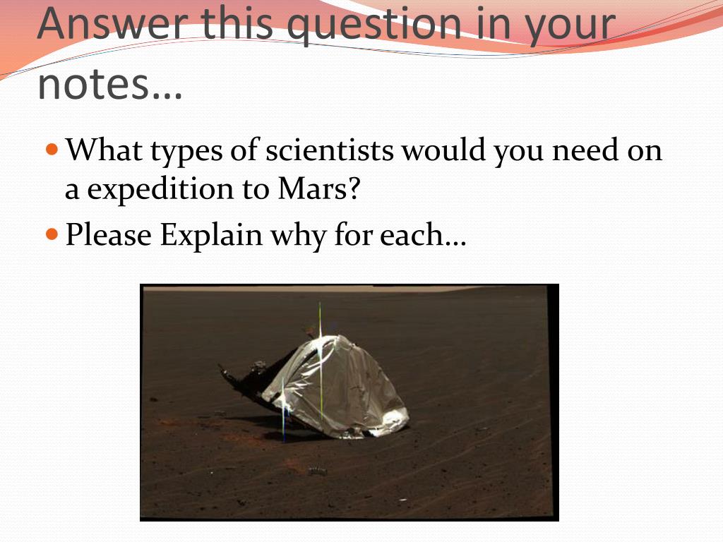 Answer this question in your notes… • What types of scientists would you need on a expedition to Mars? • Please Explain why for each…