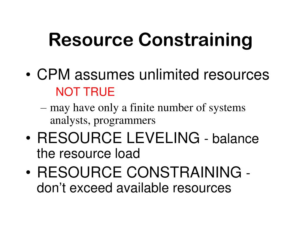 Resource Constraining • CPM assumes unlimited resources NOT TRUE • may have only a finite number of systems analysts, programmers • RESOURCE LEVELING - balance the resource load • RESOURCE CONSTRAINING - don’t exceed available resources