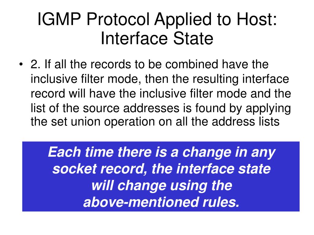IGMP Protocol Applied to Host: Interface State • 2. If all the records to be combined have the inclusive filter mode, then the resulting interface record will have the inclusive filter mode and the list of the source addresses is found by applying the set union operation on all the address lists Each time there is a change in any socket record, the interface state will change using the above-mentioned rules.