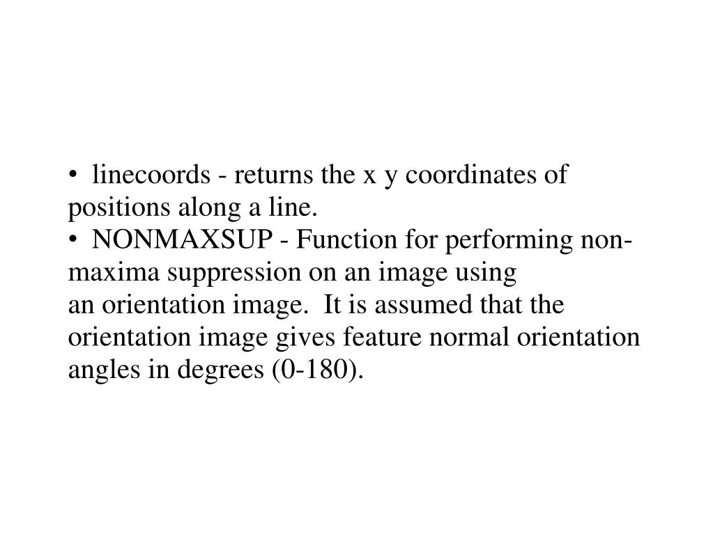 linecoords - returns the x y coordinates of positions along a line. • NONMAXSUP - Function for performing non-maxima suppression on an image using an orientation image. It is assumed that the orientation image gives feature normal orientation angles in degrees (0-180).