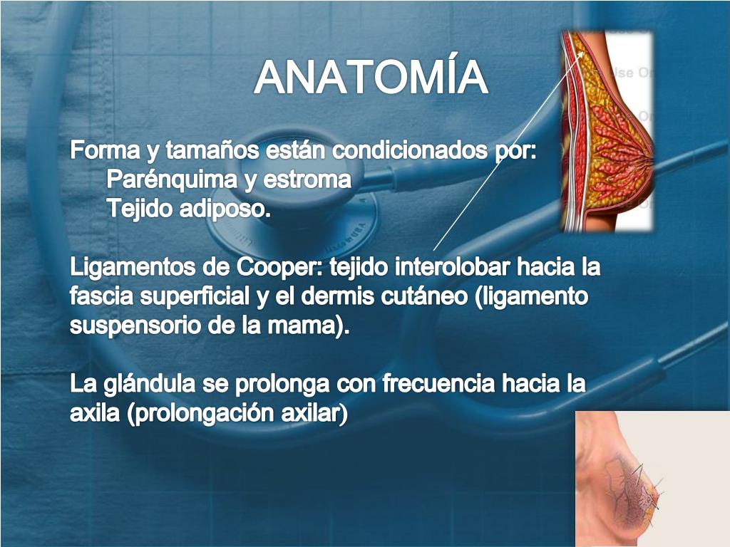 ANATOMÍA • Forma y tamaños están condicionados por: • Parénquima y estroma • Tejido adiposo. • Ligamentos de Cooper: tejido interolobar hacia la fascia superficial y el dermis cutáneo (ligamento suspensorio de la mama). • La glándula se prolonga con frecuencia hacia la axila (prolongación axilar)