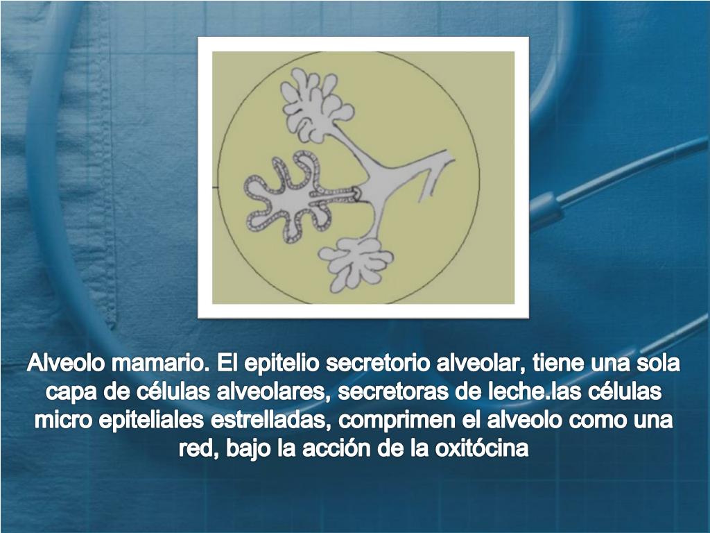 Alveolo mamario. El epitelio secretorio alveolar, tiene una sola capa de células alveolares, secretoras de leche.las células micro epiteliales estrelladas, comprimen el alveolo como una red, bajo la acción de la oxitócina