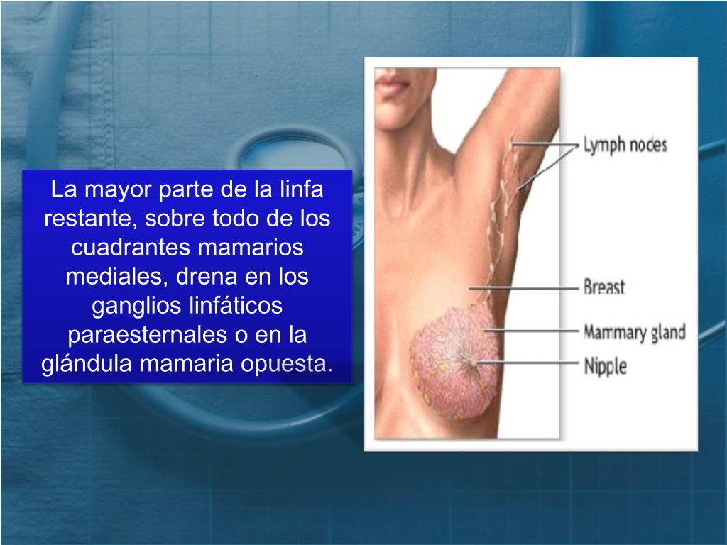 La mayor parte de la linfa restante, sobre todo de los cuadrantes mamarios mediales, drena en los ganglios linfáticos paraesternaleso en la glándula mamaria opuesta.
