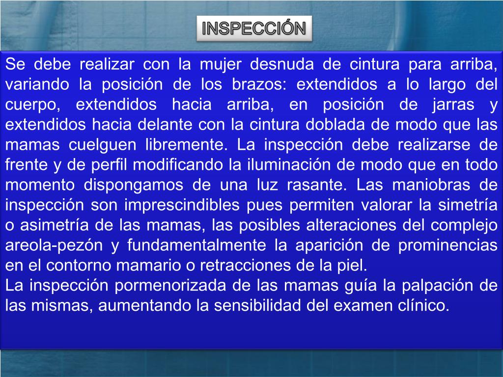 INSPECCIÓN Se debe realizar con la mujer desnuda de cintura para arriba, variando la posición de los brazos: extendidos a lo largo del cuerpo, extendidos hacia arriba, en posición de jarras y extendidos hacia delante con la cintura doblada de modo que las mamas cuelguen libremente. La inspección debe realizarse de frente y de perfil modificando la iluminación de modo que en todo momento dispongamos de una luz rasante. Las maniobras de inspección son imprescindibles pues permiten valorar la simetría o asimetría de las mamas, las posibles alteraciones del complejo areola-pezón y fundamentalmente la aparición de prominencias en el contorno mamario o retracciones de la piel. La inspección pormenorizada de las mamas guía la palpación de las mismas, aumentando la sensibilidad del examen clínico.