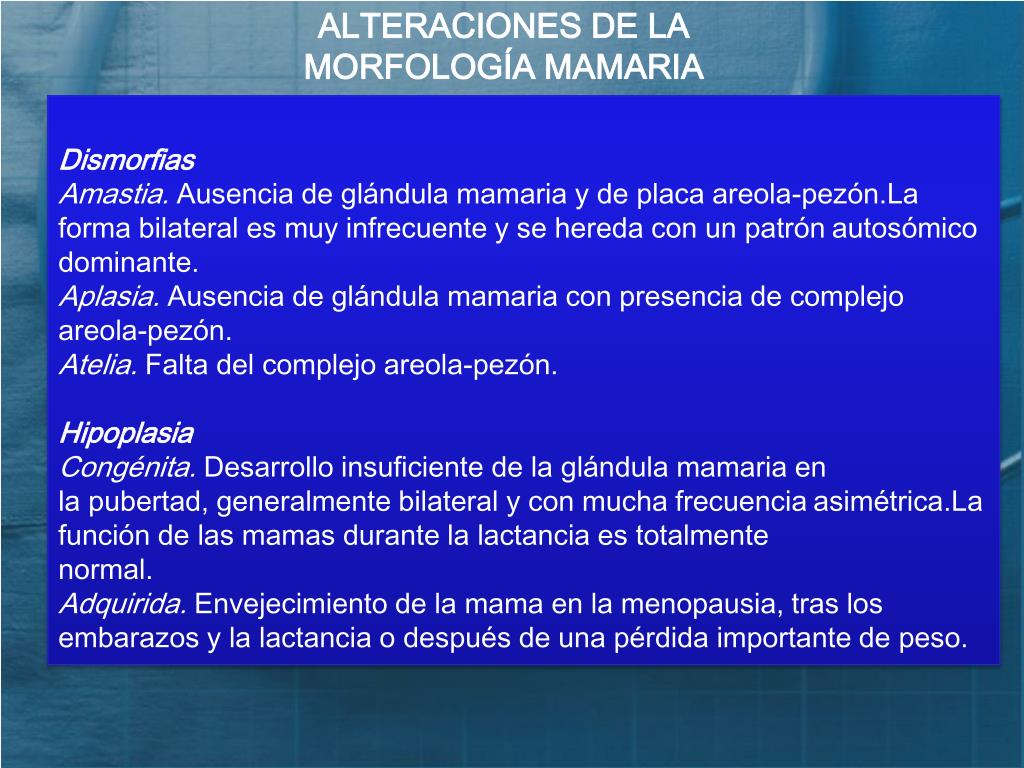 ALTERACIONES DE LA MORFOLOGÍA MAMARIA Dismorfias Amastia. Ausencia de glándula mamaria y de placa areola-pezón.Laforma bilateral es muy infrecuente y se hereda con un patrón autosómicodominante. Aplasia. Ausencia de glándula mamaria con presencia de complejo areola-pezón. Atelia. Falta del complejo areola-pezón. Hipoplasia Congénita. Desarrollo insuficiente de la glándula mamaria en la pubertad, generalmente bilateral y con mucha frecuencia asimétrica.Lafunción de las mamas durante la lactancia es totalmente normal. Adquirida. Envejecimiento de la mama en la menopausia, tras los embarazos y la lactancia o después de una pérdida importante de peso.