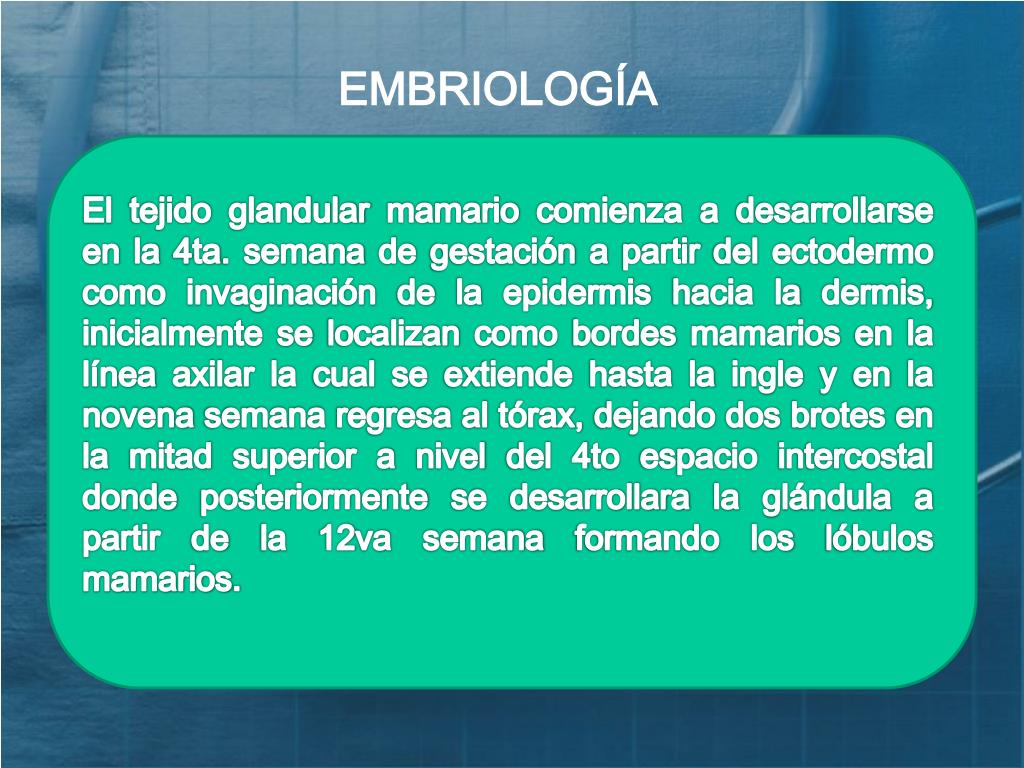 EMBRIOLOGÍA El tejido glandular mamario comienza a desarrollarse en la 4ta. semana de gestación a partir del ectodermo como invaginación de la epidermis hacia la dermis, inicialmente se localizan como bordes mamarios en la línea axilar la cual se extiende hasta la ingle y en la novena semana regresa al tórax, dejando dos brotes en la mitad superior a nivel del 4to espacio intercostal donde posteriormente se desarrollara la glándula a partir de la 12va semana formando los lóbulos mamarios.