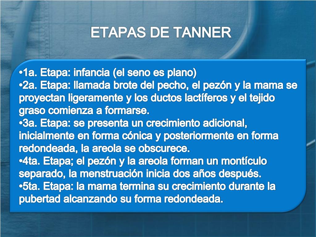 ETAPAS DE TANNER • 1a. Etapa: infancia (el seno es plano) • 2a. Etapa: llamada brote del pecho, el pezón y la mama se proyectan ligeramente y los ductos lactíferos y el tejido graso comienza a formarse. • 3a. Etapa: se presenta un crecimiento adicional, inicialmente en forma cónica y posteriormente en forma redondeada, la areola se obscurece. • 4ta. Etapa; el pezón y la areola forman un montículo separado, la menstruación inicia dos años después. • 5ta. Etapa: la mama termina su crecimiento durante la pubertad alcanzando su forma redondeada.