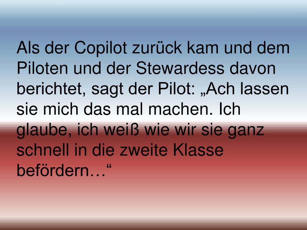 Als der Copilot zurück kam und dem Piloten und der Stewardess davon berichtet, sagt der Pilot: „Ach lassen sie mich das mal machen. Ich glaube, ich weiß wie wir sie ganz schnell in die zweite Klasse befördern…“