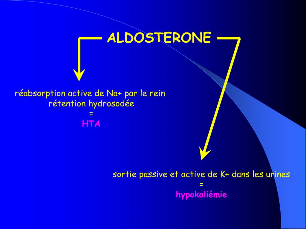 ALDOSTERONE réabsorption active de Na+ par le rein rétention hydrosodée = HTA sortie passive et active de K+ dans les urines = hypokaliémie