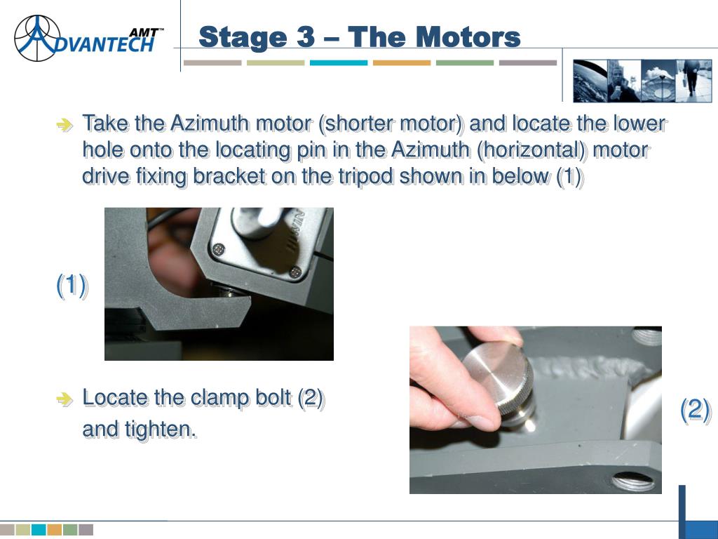 Stage 3 – The Motors • Take the Azimuth motor (shorter motor) and locate the lower hole onto the locating pin in the Azimuth (horizontal) motor drive fixing bracket on the tripod shown in below (1) • Locate the clamp bolt (2) and tighten. (1) (2)