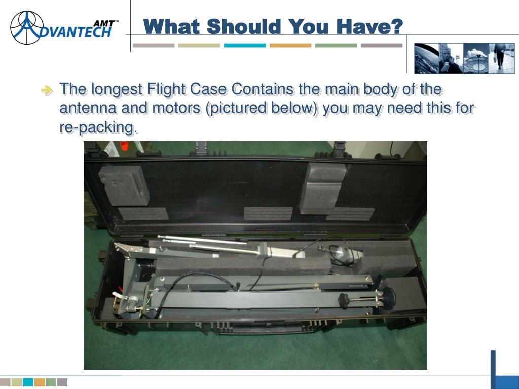What Should You Have? • The longest Flight Case Contains the main body of the antenna and motors (pictured below) you may need this for re-packing.