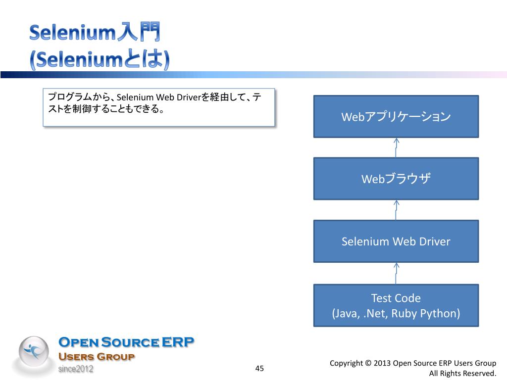 Selenium入門(Seleniumとは) プログラムから、Selenium Web Driverを経由して、テストを制御することもできる。 Webアプリケーション Webブラウザ Selenium Web Driver Test Code (Java, .Net, Ruby Python)