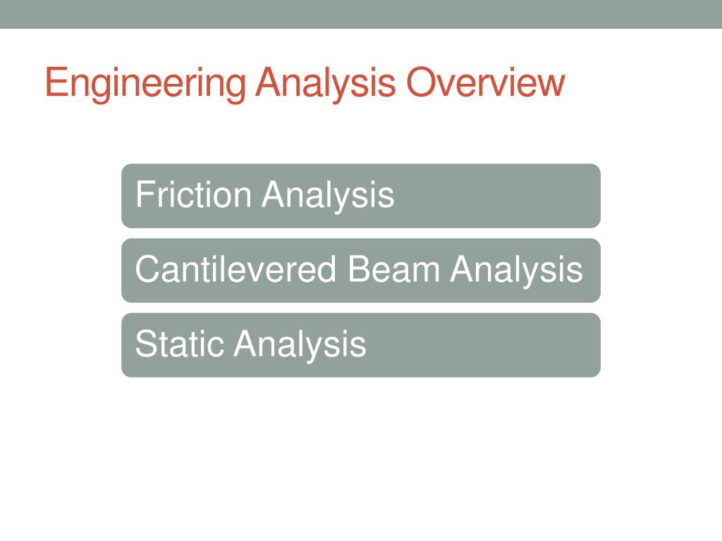 Static Analysis ASSUMPTIONS: Ax Bx By unknown: 3 unknowns Ax,BX,Cx Equations: 3 equations ΣFy=ma=0 ΣFx=ma=0 ΣM=0 Dy Cx Cy Dx