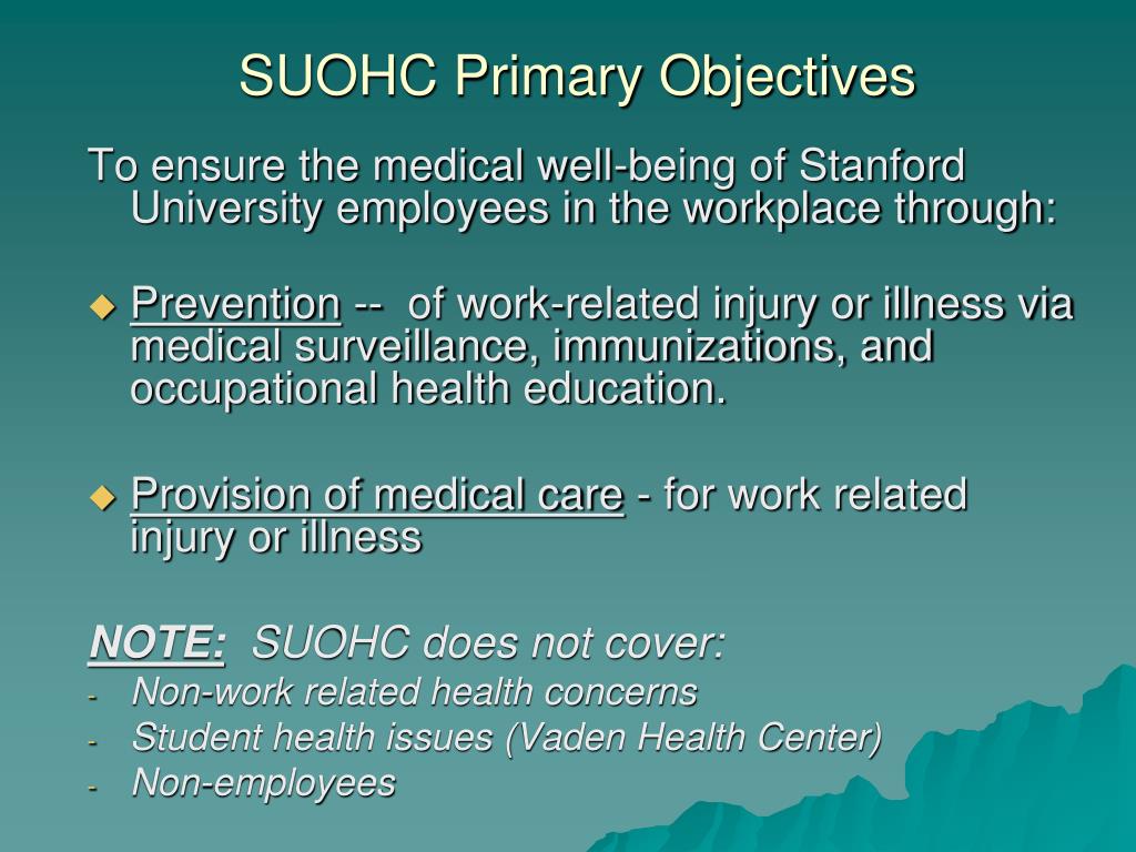 SUOHC Primary Objectives To ensure the medical well-being of Stanford University employees in the workplace through: • Prevention -- of work-related injury or illness via medical surveillance, immunizations, and occupational health education. • Provision of medical care - for work related injury or illness NOTE: SUOHC does not cover: • Non-work related health concerns • Student health issues (Vaden Health Center) • Non-employees