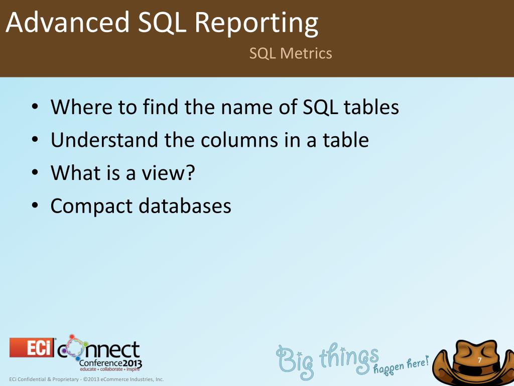 Advanced SQL Reporting SQL Metrics • Where to find the name of SQL tables • Understand the columns in a table • What is a view? • Compact databases