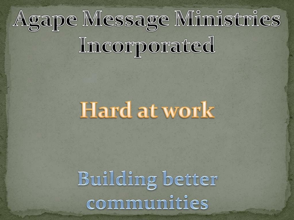 Agape M essage Ministries Incorporated. Hard at work. Building better communities . Mission Statement. Building better communities through integrity, honesty, hope, and love. This is our world . What are we going to do about it ? . Agape Message Ministries Inc. Agape.
