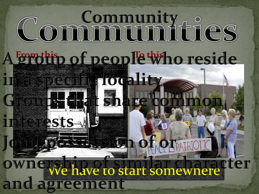 Community A group of people who reside in a specific locality Groups that share common interests Joint possession of or ownership of similar character and agreement Communities From this To this We have to start somewhere