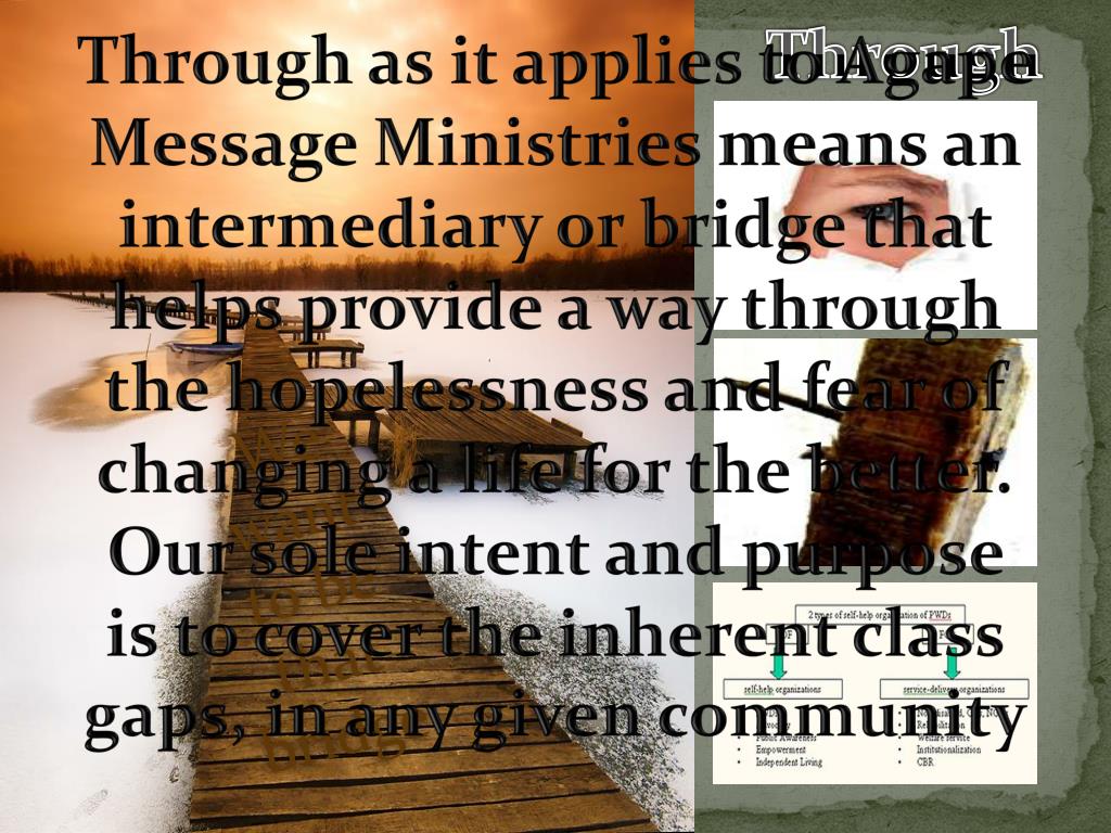 Through Through as it applies to Agape Message Ministries means an intermediary or bridge that helps provide a way through the hopelessness and fear of changing a life for the better. Our sole intent and purpose is to cover the inherent class gaps, in any given community A passage from one end or boundary to another A movement into one side and out at the other We want to be that bridge passage into and out of a specific program