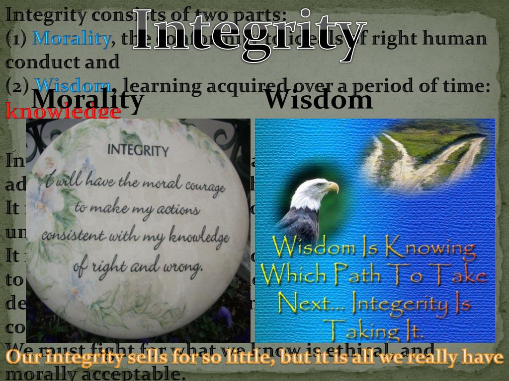Integrity Integrity consists of two parts: (1) Morality, the conformity to ideals of right human conduct and (2) Wisdom, learning acquired over a period of time: knowledge Integrity is an uncommon and uncompromising adherence to moral and ethical principles. It is a state of being whole or in an entirely unimpaired condition. It is our responsibility to do the best we can in order to take things which we know are wrong, deviant, or destructive; and make them right, appropriate, and constructive. We must fight for what we know is ethical, and morally acceptable. Morality Wisdom Our integrity sells for so little, but it is all we really have