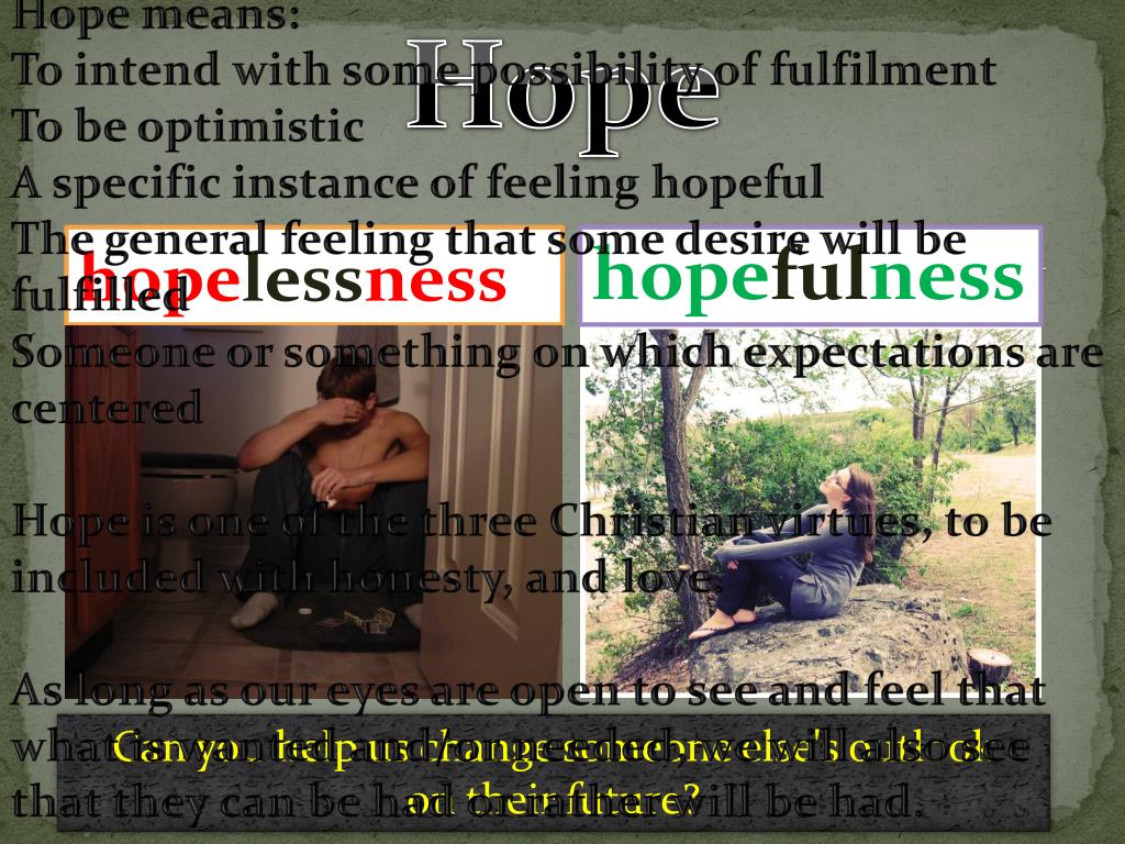 Hope means: To intend with some possibility of fulfilment To be optimistic A specific instance of feeling hopeful The general feeling that some desire will be fulfilled Someone or something on which expectations are centered Hope is one of the three Christian virtues, to be included with honesty, and love. As long as our eyes are open to see and feel that what is wanted and/or needed, we will also see that they can be had or rather will be had. We look forward with desire, reasonable confidence, and the belief that we will succeed. Hope hopelessness hopefulness Can you help us change someone else's outlook on their future?