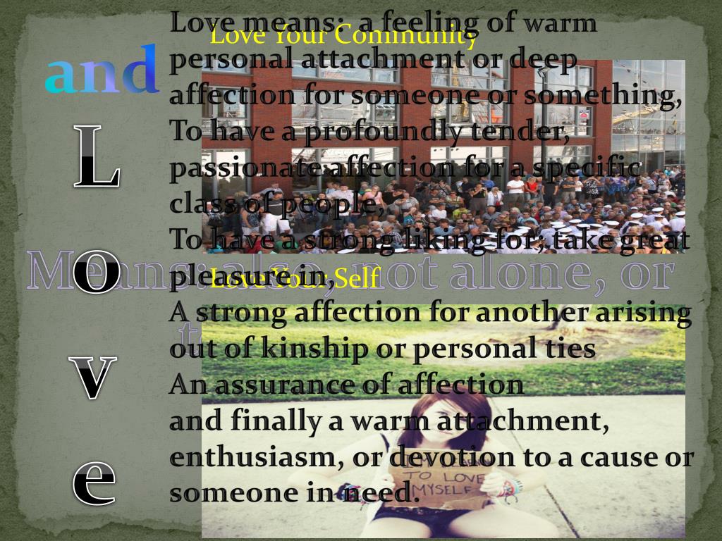 Love means: a feeling of warm personal attachment or deep affection for someone or something, To have a profoundly tender, passionate affection for a specific class of people, To have a strong liking for; take great pleasure in, A strong affection for another arising out of kinship or personal ties An assurance of affection and finally a warm attachment, enthusiasm, or devotion to a cause or someone in need. We attack the negative aspects of our community with love, anticipating the desired results. Our enthusiasm grows with evidence of that accomplishment. Love Your Community and Love Means: also, not alone, or together with Love Your Self