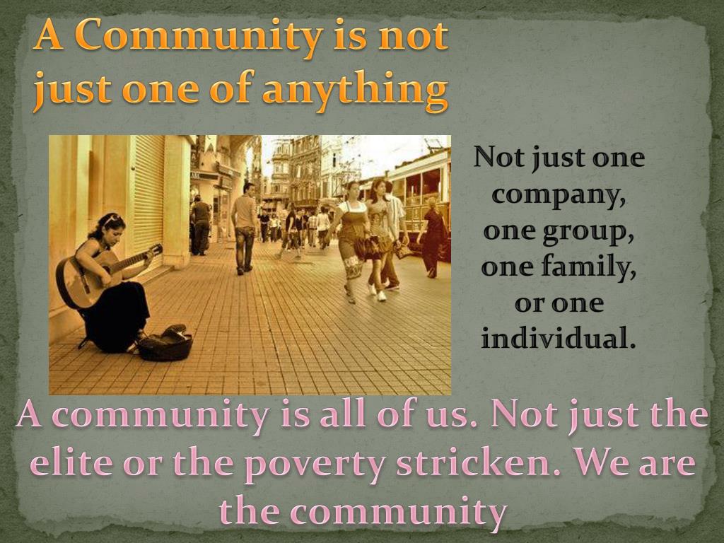 A Community is not just one of anything Not just one company, one group, one family, or one individual. A community is all of us. Not just the elite or the poverty stricken. We are the community