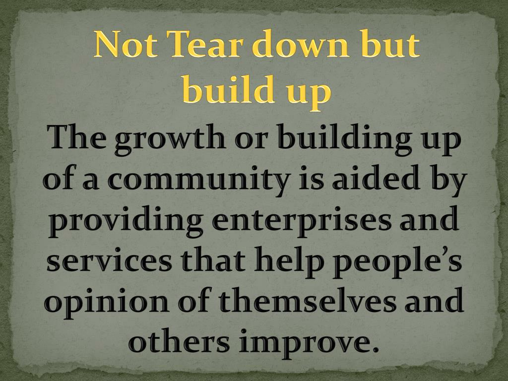 Not Tear down but build up The growth or building up of a community is aided by providing enterprises and services that help people’s opinion of themselves and others improve.