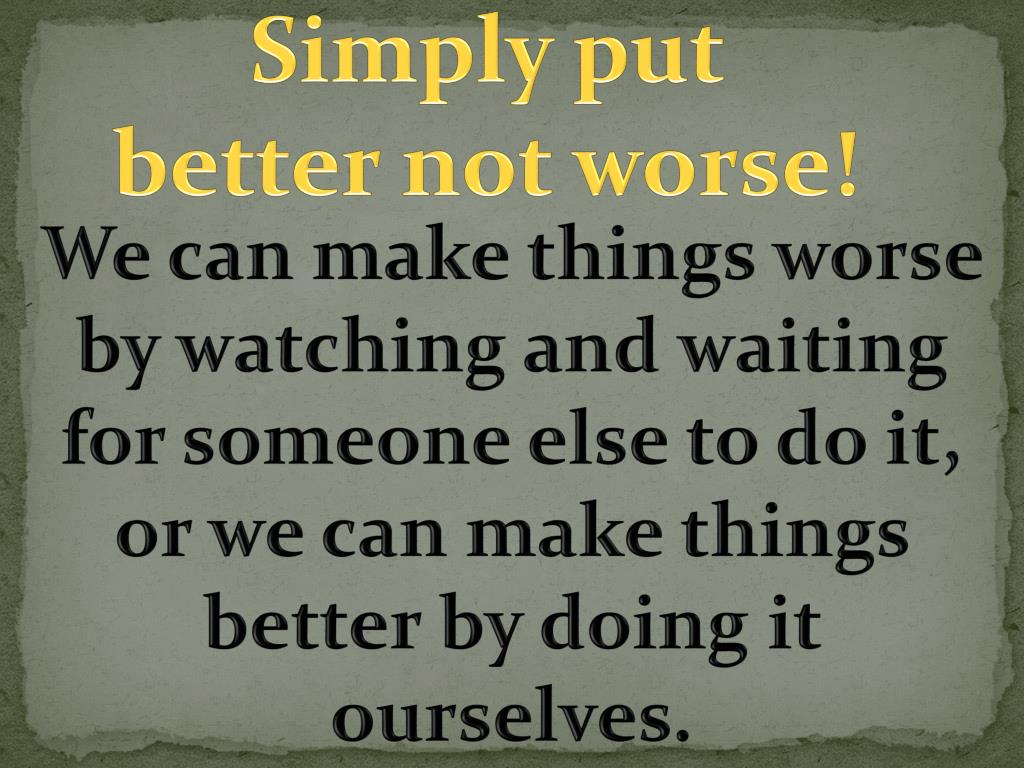 Simply put better not worse! We can make things worse by watching and waiting for someone else to do it, or we can make things better by doing it ourselves.