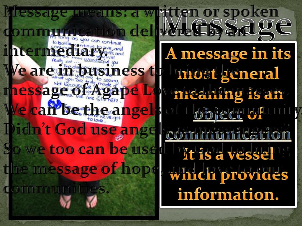 Message means: a written or spoken communication delivered by an intermediary. We are in business to bring the message of Agape Love to the masses. We can be the angels of the community. Didn’t God use angels as messengers? So we too can be used by God to bring the message of hope, and love to our communities. Message A message in its most general meaning is an objectof communicationIt is a vessel which provides information.