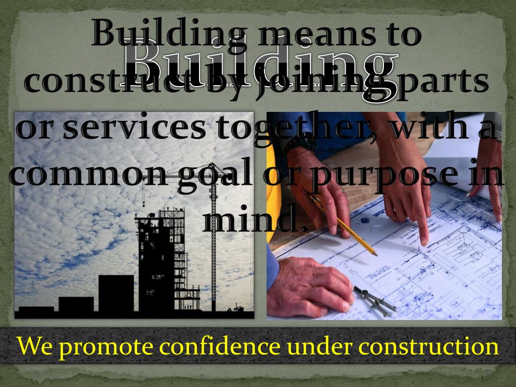 Building means to construct by joining parts or services together, with a common goal or purpose in mind. Building We promote confidence under construction