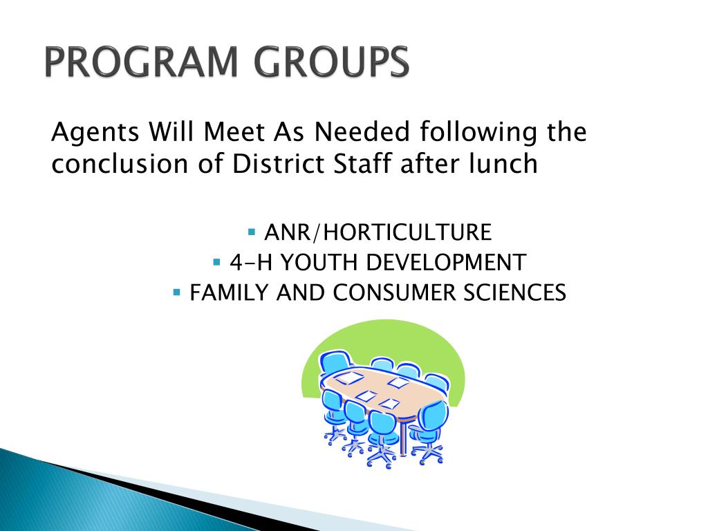 PROGRAM GROUPS Agents Will Meet As Needed following the conclusion of District Staff after lunch • ANR/HORTICULTURE • 4-H YOUTH DEVELOPMENT • FAMILY AND CONSUMER SCIENCES