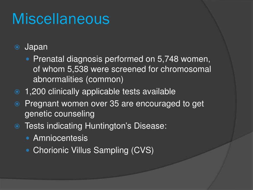 Miscellaneous • Japan • Prenatal diagnosis performed on 5,748 women, of whom 5,538 were screened for chromosomal abnormalities (common) • 1,200 clinically applicable tests available • Pregnant women over 35 are encouraged to get genetic counseling • Tests indicating Huntington’s Disease: • Amniocentesis • Chorionic Villus Sampling (CVS)