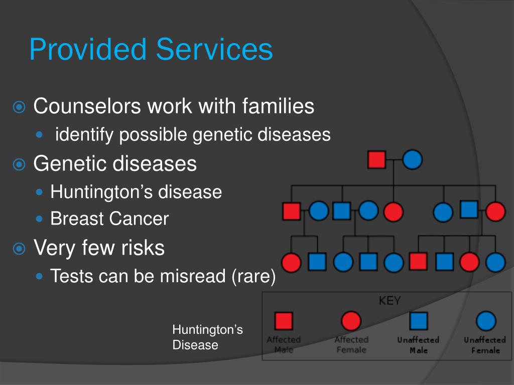 Provided Services • Counselors work with families • identify possible genetic diseases • Genetic diseases • Huntington’s disease • Breast Cancer • Very few risks • Tests can be misread (rare) Huntington’s Disease