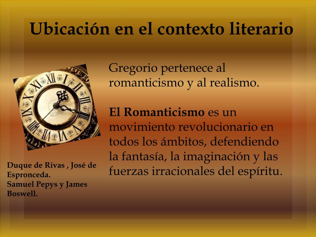 Ubicación en el contexto literario Gregorio pertenece al romanticismo y al realismo. El Romanticismo es un movimiento revolucionario en todos los ámbitos, defendiendo la fantasía, la imaginación y las fuerzas irracionales del espíritu. Duque de Rivas , José de Espronceda. Samuel Pepys y James Boswell.