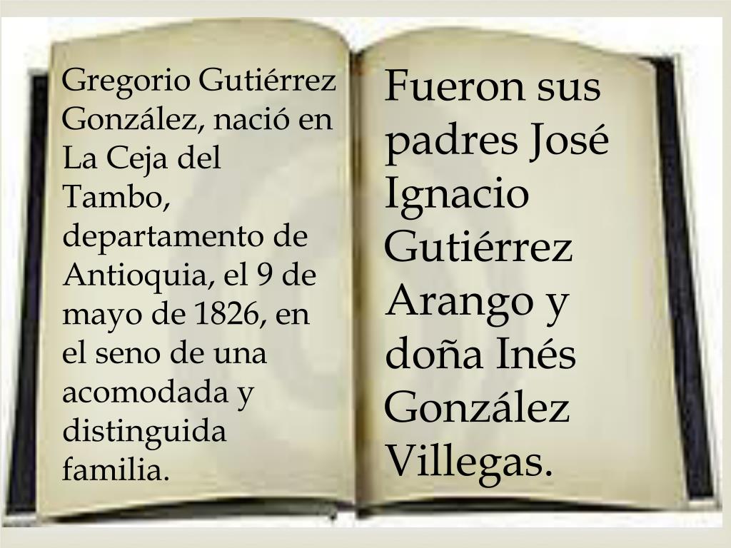 Fueron sus padres José Ignacio Gutiérrez Arango y doña Inés González Villegas. Gregorio Gutiérrez González, nació en La Ceja del Tambo, departamento de Antioquia, el 9 de mayo de 1826, en el seno de una acomodada y distinguida familia.
