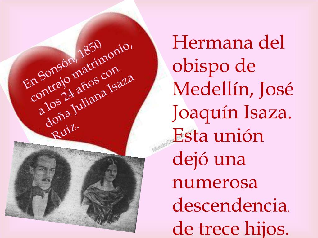 Hermana del obispo de Medellín, José Joaquín Isaza. Esta unión dejó una numerosa descendencia, de trece hijos. En Sonsón, 1850 contrajo matrimonio, a los 24 años con doña Juliana Isaza Ruiz.