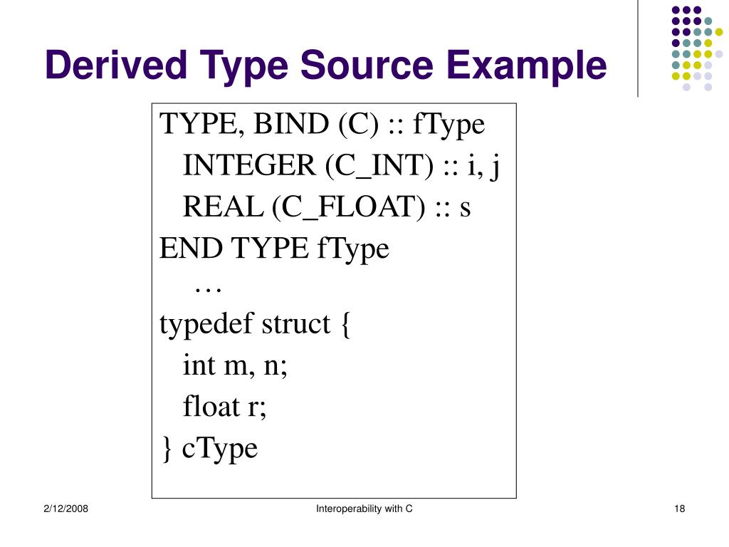 Derived Type Source Example TYPE, BIND (C) :: fType INTEGER (C_INT) :: i, j REAL (C_FLOAT) :: s END TYPE fType… typedef struct { int m, n; float r; } cType Interoperability with C
