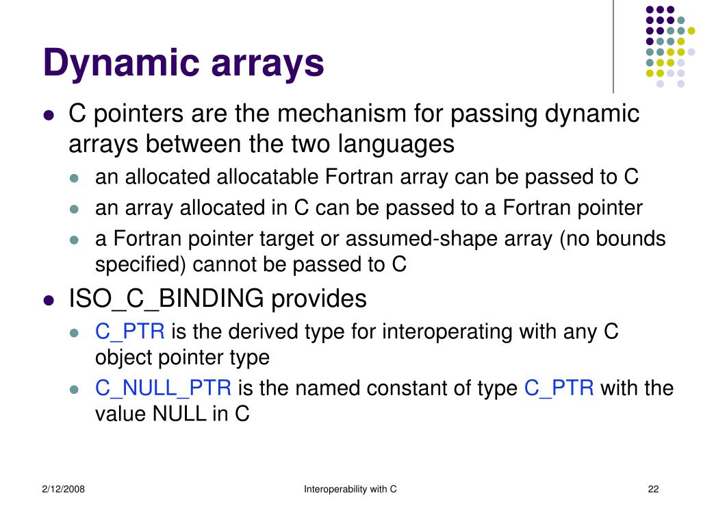 Dynamic arrays • C pointers are the mechanism for passing dynamic arrays between the two languages • an allocated allocatable Fortran array can be passed to C • an array allocated in C can be passed to a Fortran pointer • a Fortran pointer target or assumed-shape array (no bounds specified) cannot be passed to C • ISO_C_BINDING provides • C_PTR is the derived type for interoperating with any C object pointer type • C_NULL_PTR is the named constant of type C_PTR with the value NULL in C Interoperability with C