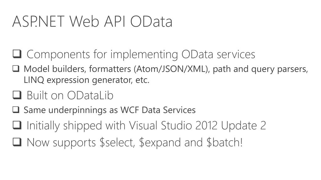 ASP.NET Web API OData • Components for implementing OData services • Model builders, formatters (Atom/JSON/XML), path and query parsers, LINQ expression generator, etc. • Built on ODataLib • Same underpinnings as WCF Data Services • Initially shipped with Visual Studio 2012 Update 2 • Now supports $select, $expand and $batch!