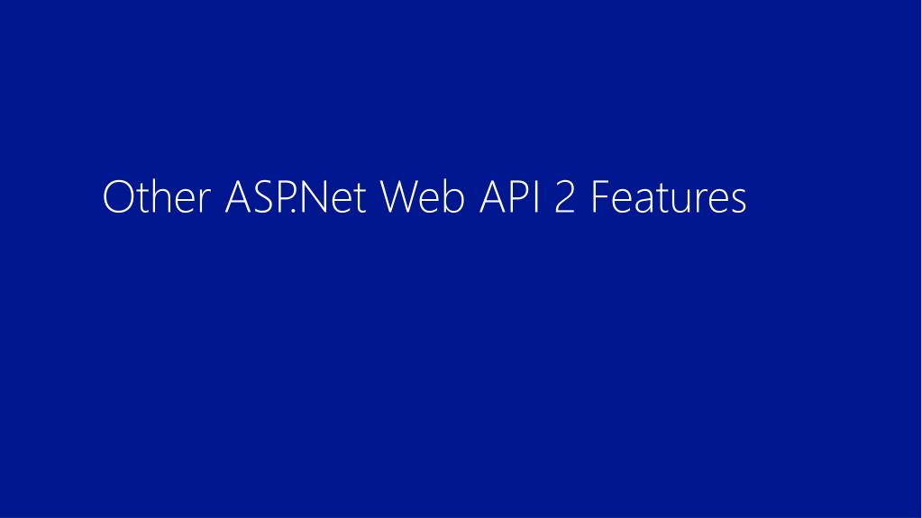 Attribute routing config.MapHttpAttributeRoutes(); config.Routes.MapHttpRoute( name: "DefaultApi", routeTemplate: "api/{controller}/{id}", defaults: new { id = RouteParameter.Optional}); • In App Start WebAPIConfig • Optional values • Default values • Inline constraints [HttpGet(“Demographics/{zipcode?}")] publicDemographicsGet(int? zipcode) { … } [HttpGet("Demographics/{zipcode=98052}")] publicDemographicsGet(int zipcode) { … } [HttpGet("people/{id:int}")] publicPerson Get(int id) { … } [HttpGet("people/{name:alpha}")] publicPerson Get(string name) { … }