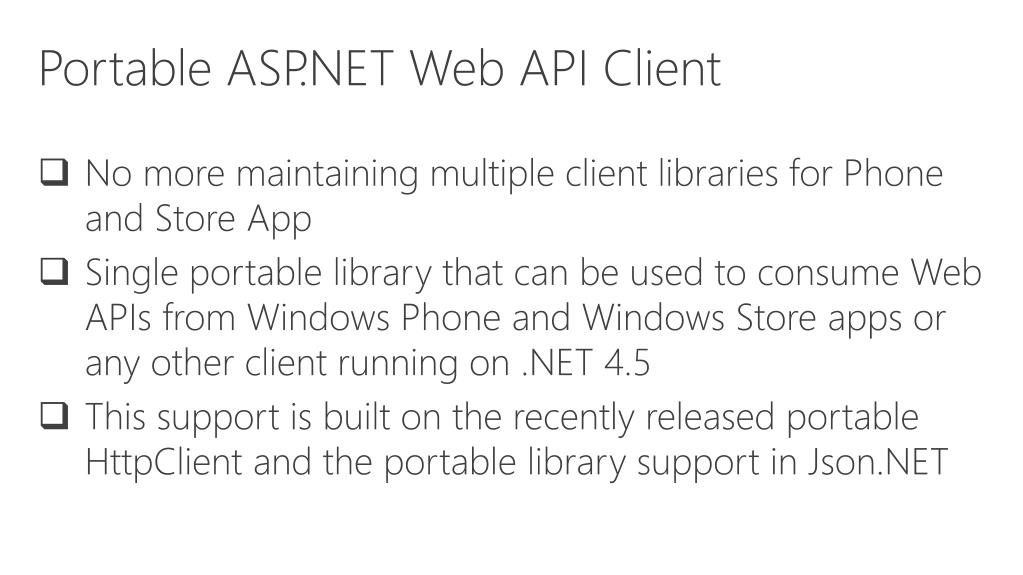 Portable ASP.NET Web API Client • No more maintaining multiple client libraries for Phone and Store App • Single portable library that can be used to consume Web APIs from Windows Phone and Windows Store apps or any other client running on .NET 4.5 • This support is built on the recently released portable HttpClient and the portable library support in Json.NET