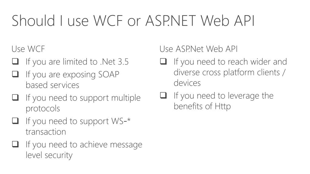 Should I use WCF or ASP.NET Web API Use ASP.Net Web API If you need to reach wider and diverse cross platform clients / devices If you need to leverage the benefits of Http • Use WCF • If you are limited to .Net 3.5 • If you are exposing SOAP based services • If you need to support multiple protocols • If you need to support WS-* transaction • If you need to achieve message level security