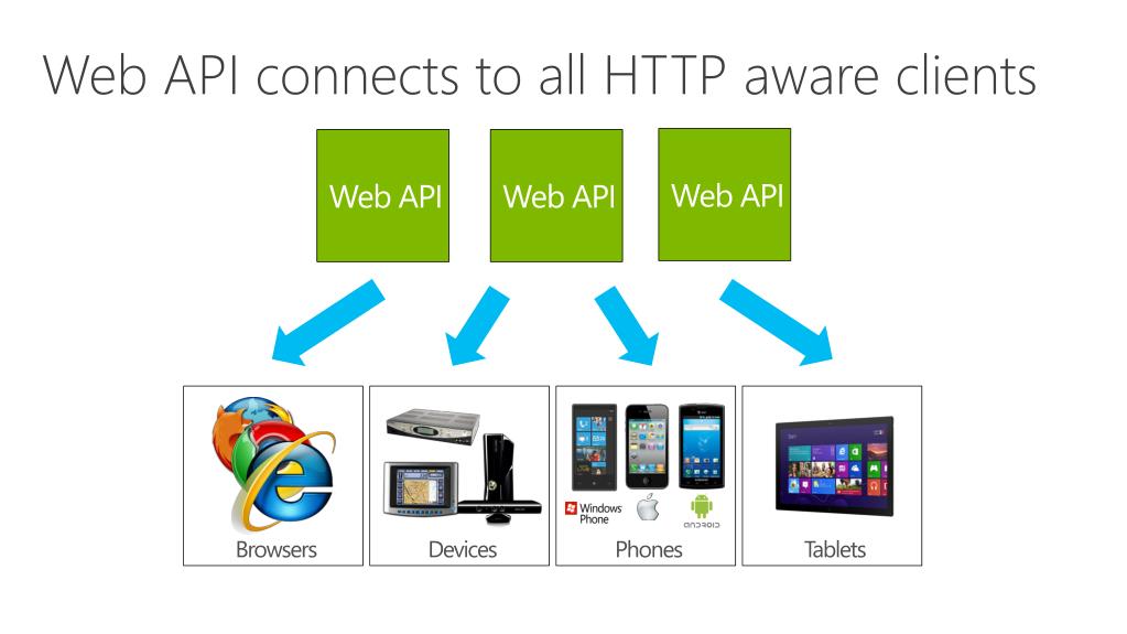 Web API connects to all HTTP aware clients Web API Web API Web API Devices Browsers Phones Tablets