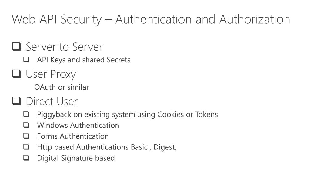 Web API Security – Authentication and Authorization • Server to Server • API Keys and shared Secrets • User Proxy OAuth or similar • Direct User • Piggyback on existing system using Cookies or Tokens • Windows Authentication • Forms Authentication • Http based Authentications Basic , Digest, • Digital Signature based