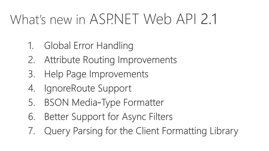 What’s new in ASP.NET Web API 2.1 • Global Error Handling • Attribute Routing Improvements • Help Page Improvements • IgnoreRoute Support • BSON Media-Type Formatter • Better Support for AsyncFilters • Query Parsing for the Client Formatting Library