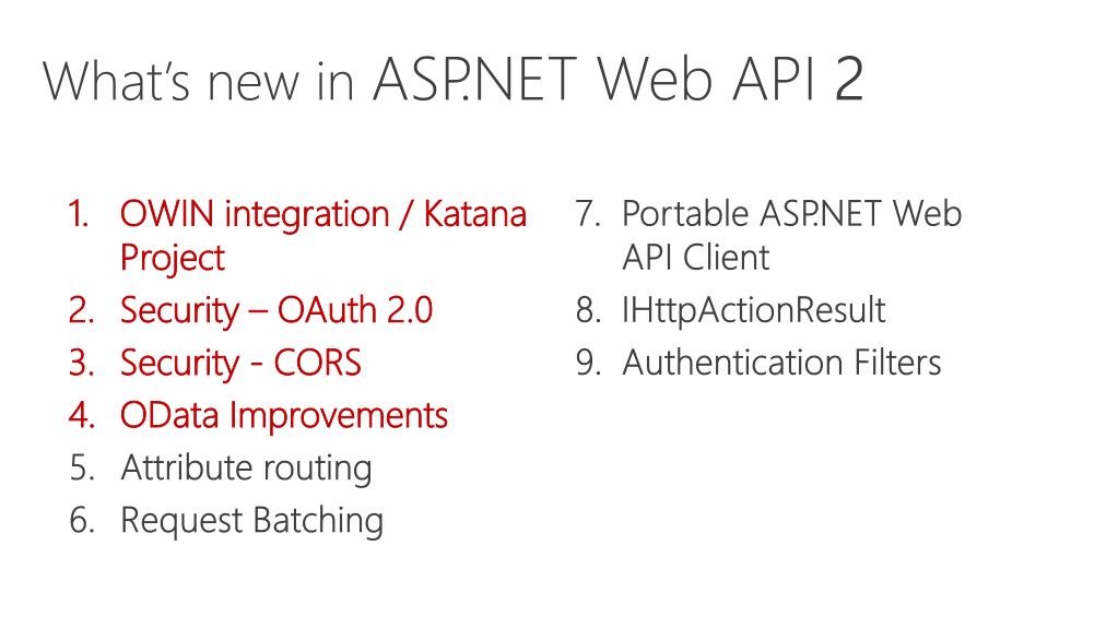 What’s new in ASP.NET Web API 2 Portable ASP.NET Web API Client IHttpActionResult Authentication Filters • OWIN integration / Katana Project • Security – OAuth 2.0 • Security - CORS • OData Improvements • Attribute routing • Request Batching