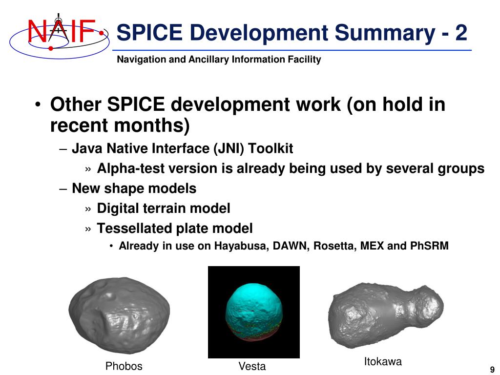 SPICE Development Summary - 2 • Other SPICE development work (on hold in recent months) • Java Native Interface (JNI) Toolkit • Alpha-test version is already being used by several groups • New shape models • Digital terrain model • Tessellated plate model • Already in use on Hayabusa, DAWN, Rosetta, MEX and PhSRM Itokawa Phobos Vesta