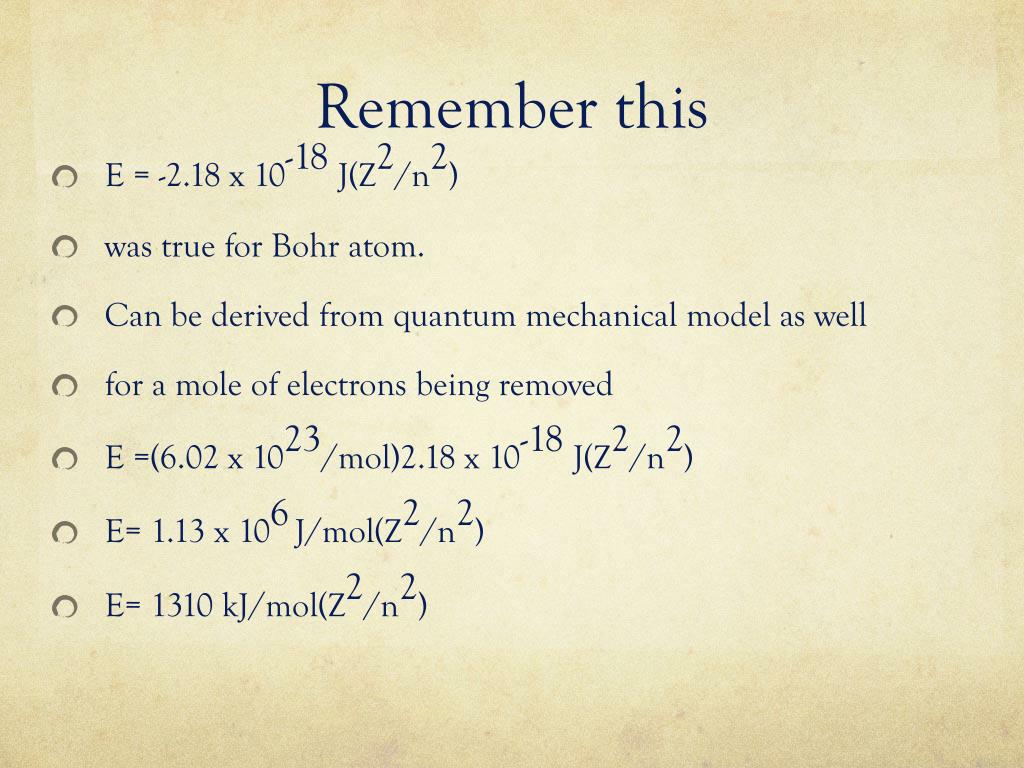 Remember this • E = -2.18 x 10-18 J(Z2/n2) • was true for Bohr atom. • Can be derived from quantum mechanical model as well • for a mole of electrons being removed • E =(6.02 x 1023/mol)2.18 x 10-18 J(Z2/n2) • E= 1.13 x 106J/mol(Z2/n2) • E= 1310 kJ/mol(Z2/n2)